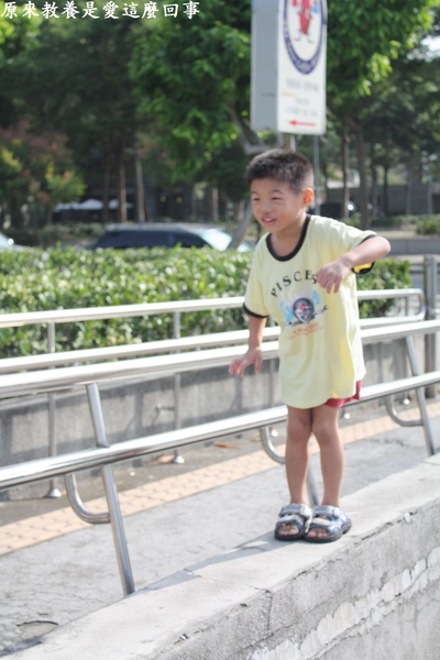 今天走大積木的平衡木,勛一開始時不願意參加,原因是我們等待范老師時,全班一起數數,但勛卻在中途有點不開心的走開,他的理由是其他小朋友數太快了,他沒有辦法跟上數數的速度。因此那時候的他心情不好,一個人默默的走到門口想一走了之,但是被我強拉回來。當課程開始時,或許是受到剛才數數時那股不好情緒的影響,他還是不願意加入其它小朋友的行列。於是,在與他僵持了一段時間之後,我決定以半勉強的方式引導他,但是他卻推拖說他不會。然而,經過老師從旁鼓勵之後,他終於可以勇敢的放開老師的手往前走,雖然走的很小步,卻走的非常穩,完全不用老師在旁扶著。走過積木橋後,還可以很平穩的跨越兩間距20-25公分,高80公分的平台,並且排隊輪流等待再玩一次。等到課程一結束,勛甚至還意猶未盡的說還想再玩。很高興勛能夠全程參與這次的課程,他真的是越來越厲害了。爸爸媽媽平常也可以多讓他走沿著線線走,比方說:家裡的磁磚或是公園圍邊凸起的地方,都可以做這方面的練習,我相信他會越來越棒的。