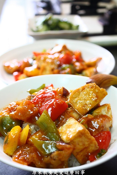 烤地瓜是今日的早餐菜單,洗淨瀝乾的地瓜送入烤箱以上下火200度烘烤約1個小時,約莫烤至地瓜釋出焦糖即成。糖醋油豆腐青蔬是今日午餐菜色之一,作法參考"Carol自在生活"示範的"糖醋豆皮"食譜,只有部分食材略做更動,如小黃瓜換成青椒,豆皮換成油豆腐,作法則依然仿照食譜列舉的。這道菜嚐來酸甜美味,不過基於個人口味,我覺得過於黏稠,若減少太白粉的份量約至1小匙,味道會更加爽口甘甜。鋪在飯上,便是一碗紅通討喜的糖醋油豆腐青蔬蓋飯。