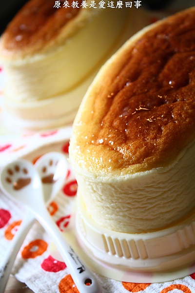 從上次製作到現在,隔了好長一段時間,面對機具,材料,和作法難免生疏,加上時間的壓力,得趕在孩子就寢前烘烤完成,因此,忙中有錯,將事先擠好但未量秤好份量的檸檬汁,在趕忙打發蛋白的著急當頭,毫無考慮便一鼓作氣的拾起碗缽全數倒入。啊~~~~~~,心頭一驚,一聲慘叫,完了。擔心過多的水分會影響蛋白打發的程度,甚至徹底失敗......,萬幸的是,經過較長的蛋白和細砂糖水乳交融的等待過程,終於在比平日多出雙倍的打發時間之後,蛋白霜成形了。與蛋黃糊拌妥後,倒入乳酪蛋糕專用的橢圓模型,便可送入烤箱,上下火150度烤30分上色,調整上下火為120度續烤50分至熟。