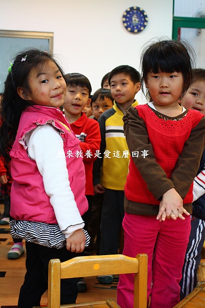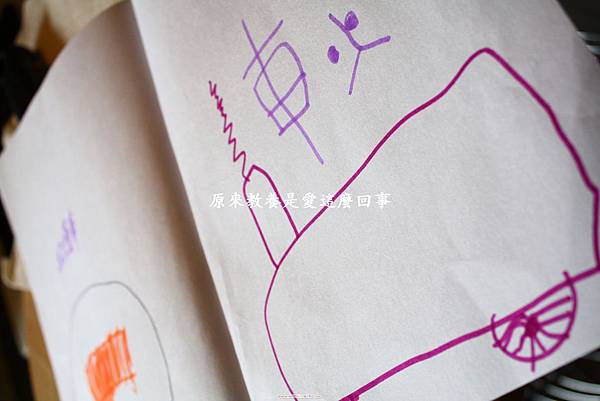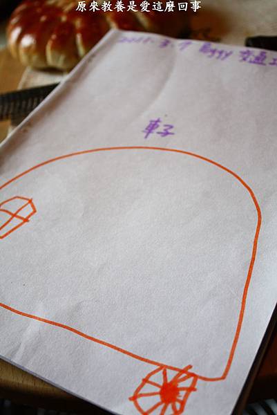如往常,為孩子的創作記錄時,倩提醒我,留下最後那一張火車圖畫,由她自己記錄。一面以彩筆"畫"出可愛的"火"字時,倩一面開心的說,雖然我不會寫其他車子,可是我會寫"火車"了。畫畢,為她鼓掌喝采之餘,詢問她是否願意與書房裡的外子分享。走出書房,得到的是驚訝的讚美,倩更開心了。