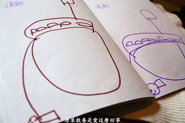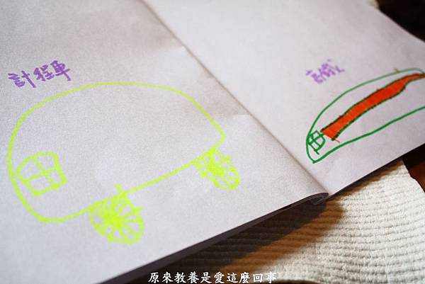 幼稚園裡第二個學期的學習主題由之前的食物轉換至現在的交通工具,也是孩子為之興致高昂的地方。昨日,倩就在晚飯後,利用幾張圖畫紙以釘書機釘牢,便著手認真的在一頁翻著一頁的書紙上,繪製出各式各樣的交通工具,車子(倩指的應該是路上常見的轎車吧?!),公車,計程車,飛機,高鐵,漁船(一艘是倩掌舵的,一艘是我,我們都分別捕到一條很大的魚),救護車等。