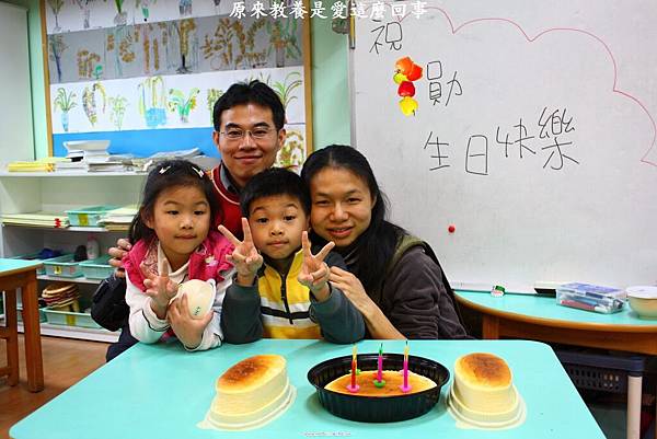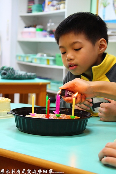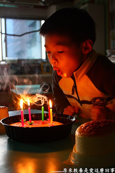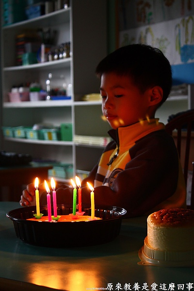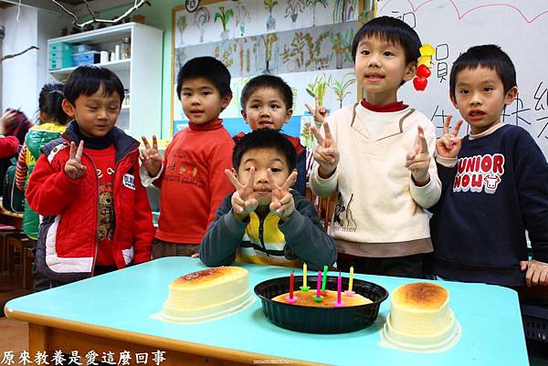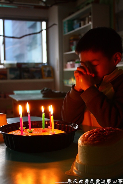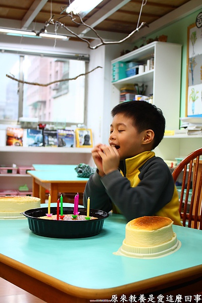 明天是勛的生日,老早,他就盤算好宴請老師和同學的生日蛋糕。媽媽,我要一個很大很大的乳酪蛋糕。勛一面形容,一面雙手高高舉起在胸前畫了一個很大的圓,繞過了他頂上的那顆小圓頭,和包括肚臍以下鼓脹的肚皮。就是我以前生日吃過的那種,不過是要圓形的。勛補充說明。