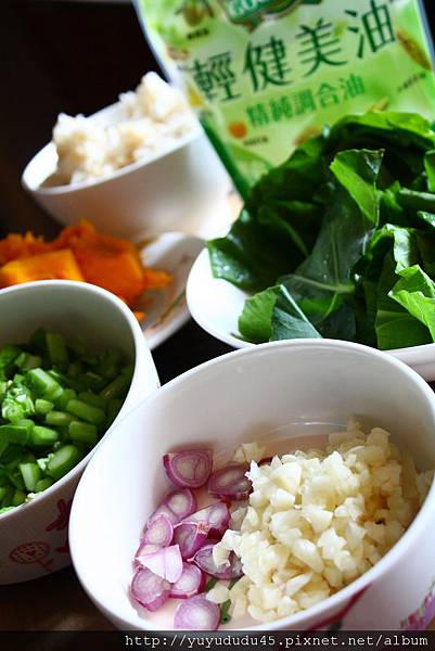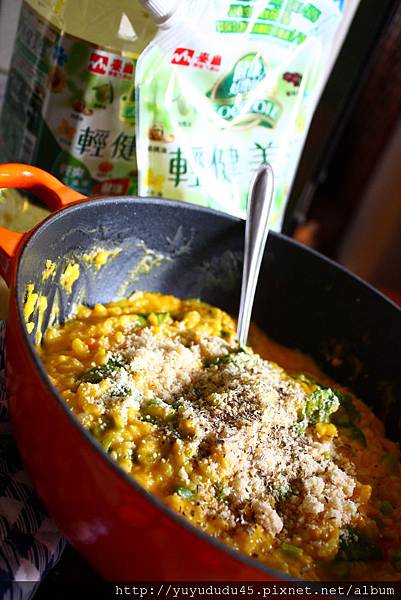 需要的材料與作法列舉如下,材料,蒜末和紅蔥頭末適量,蒸熟的南瓜泥2碗,甘藍菜心丁適量,甘藍菜葉適量,鮮奶約2杯(依個人喜好的濃稠程度決定)混合一半糙米一半白米的隔夜糙米白飯1大碗,鹽,黑胡椒,和帕瑪森乳酪粉適量,義式香料少許。作法,倒入泰山輕健美油,冷油爆香蒜末和紅蔥頭,香氣溢出後,放入甘藍菜心丁拌炒,放入南瓜泥以推壓方式和其他食材炒開和勻,續入鮮奶約略煮沸,倒入糙米白飯和甘藍菜葉攪勻,待再次滾沸,撒入調味,與帕瑪森乳酪粉和義式香料,即可覆蓋起鍋了。