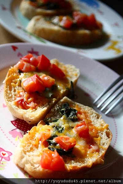 製作瑪格莉特圓法國需要的材料,圓法國2個,蕃茄丁1/2顆,九層塔碎屑2串,乳酪絲適量,蕃茄醬少許。作法,圓法國切片,切面朝上,分別塗抹蕃茄醬,依序放上九層塔碎屑,乳酪絲,蕃茄丁,再一層乳酪絲,入預熱200度烤箱,烤熱至乳酪絲融化,取出。