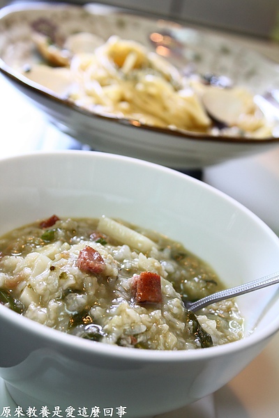 晚餐,菜粽粥的作法更是簡便。材料,現成的番薯葉粥2人份,傳統肉粽1顆,荷蘭香腸切丁1條,竹筍丁1碗,高湯1碗,水適量,韭菜花段4支,雞蛋1顆。作法,番薯葉粥和壓碎的肉粽同時入高湯鍋裡以中小火微微煮沸,放入荷蘭香腸丁,竹筍丁,和水,煮至再次滾沸,期間可視個人口味置入適量的水調整濃稠度,最後拋入韭菜花段,與打個蛋花,拌勻,如此一來,濃稠,香氣十足,且帶著鹹米糕粥影子的菜粽粥竟搏得不嗜食鹹粥的孩子的小嘴青睞,難得大讚著它的好。