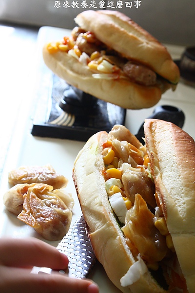 牛奶哈司麵包2份,乳酪片2片,高麗菜絲適量,罐頭玉米粒適量,青醬適量,番茄醬和美乃滋少許,煎餛飩8顆。------08/22/2010