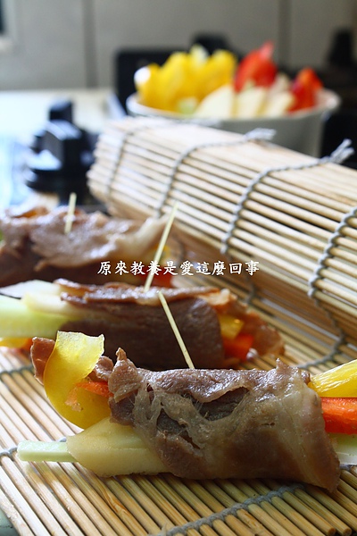 五花豬肉片入乾鍋煎熟,滴少許醬油略作調味夾起後攤平,依序鋪上紅黃甜椒絲,小黃瓜絲,和蘋果絲捲起,以截取與小指同長的天使義大麵固定,淋上和風沙拉醬,炎炎夏日裡的清爽肉料理酸甜上桌了。