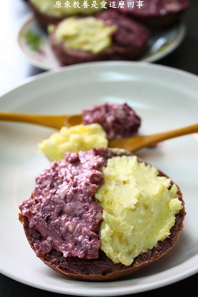 今天早餐內容是昨天做的桑椹貝果,簡單的味道適合搭配抹醬一起食用,於是利用乳酪起司分別與前天做的桑椹果醬混合成桑椹乳酪起司,和蒸熟放涼的地瓜與少許鮮奶調合成鮮奶地瓜乳酪起司,做出兩款頗受家人好評與喜愛的黃抹醬與紫抹醬。