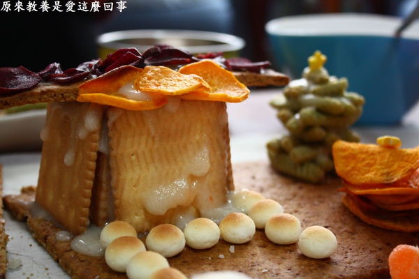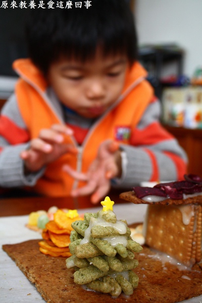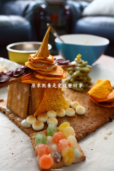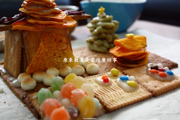 製作薯作糖果餅乾屋沒有訣竅,全憑隨興,自由發揮,利用現成與手作餅乾,想裝飾什麼就裝飾什麼,想怎麼裝飾就怎麼裝飾。更早之前與孩子購買餅乾的時候,瞥見兒時的零食蝦味先推出新口味,海苔蝦味先,那時只是突發其想的想起準備的餅乾裡沒有綠色的,若是拿它做一棵聖誕樹,也許可行。沒想到做出來效果挺不錯的。