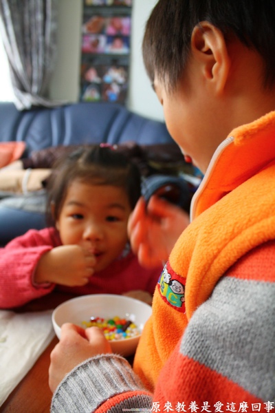 做薯片糖果餅乾屋的進度告一段落,孩子得到允許之後對早已覬覦好久的糖果展開猛攻。