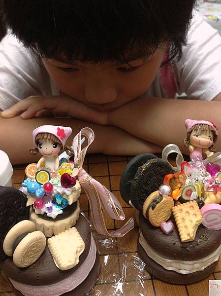 來到接倩的時間時,發現她因著無法順利在課程結束時完成作品而心裡不快。為此,我和外子打消了先載送我和倩返家的計畫,陪伴倩繼續著墨於劉老師交待的可以加工的部分,諸如擠奶油土,放上小裝飾等等。
