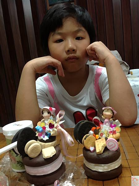 可以現在做的部分完成了,倩仍舊感到不愉快,她懊惱著作品看起來太過單調。好言相勸她,不管做任何事切忌操之過急,如此反而容易壞事。就舉今天的半成品為例,若不是她拗著老師一定要在今天完成作品,應該是要等待幾天變得堅挺硬實的Oreo餅乾,也不會猶如揠苗助長般,扭曲著身子立在夾心蛋糕的基底上。倩這才放下她固執的心。