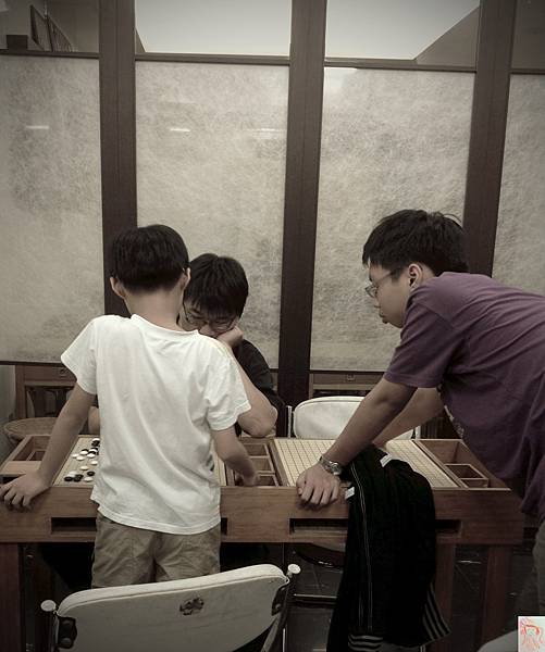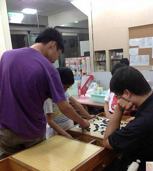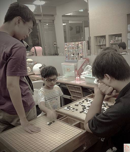 今天分別是冕和倩在快樂學圍棋上段位菁英班和級位班的第二次上課。雖然段位班的上課時間是從午后一點半一路上到七點,長達六個半小時,除了上課之初詹老師講解一盤高手的棋局外,剩餘時間便是與各個段位的同學(僅冕是二段,其他同學皆四段以上,最高七段)採巡迴賽下棋,然,冕並不以為苦,反而樂在其中。