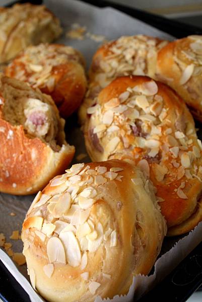 註(直接法):高筋麵包270克+低筋麵粉30克+即溶酵母粉3/4小匙+雞蛋1顆加鮮奶共200克+細砂糖20克+無鹽奶油30克+鹽1/8小匙+杏仁片適量