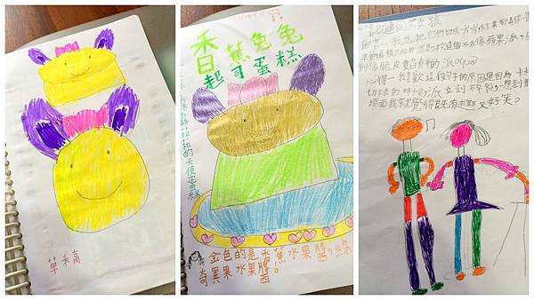 孩子分別在閱讀「露露和菈菈的天使蛋糕」和「達爾文女孩」後撰寫與繪製的心得。過程中,除了增加書寫的機會,亦加強孩子認字的能力。